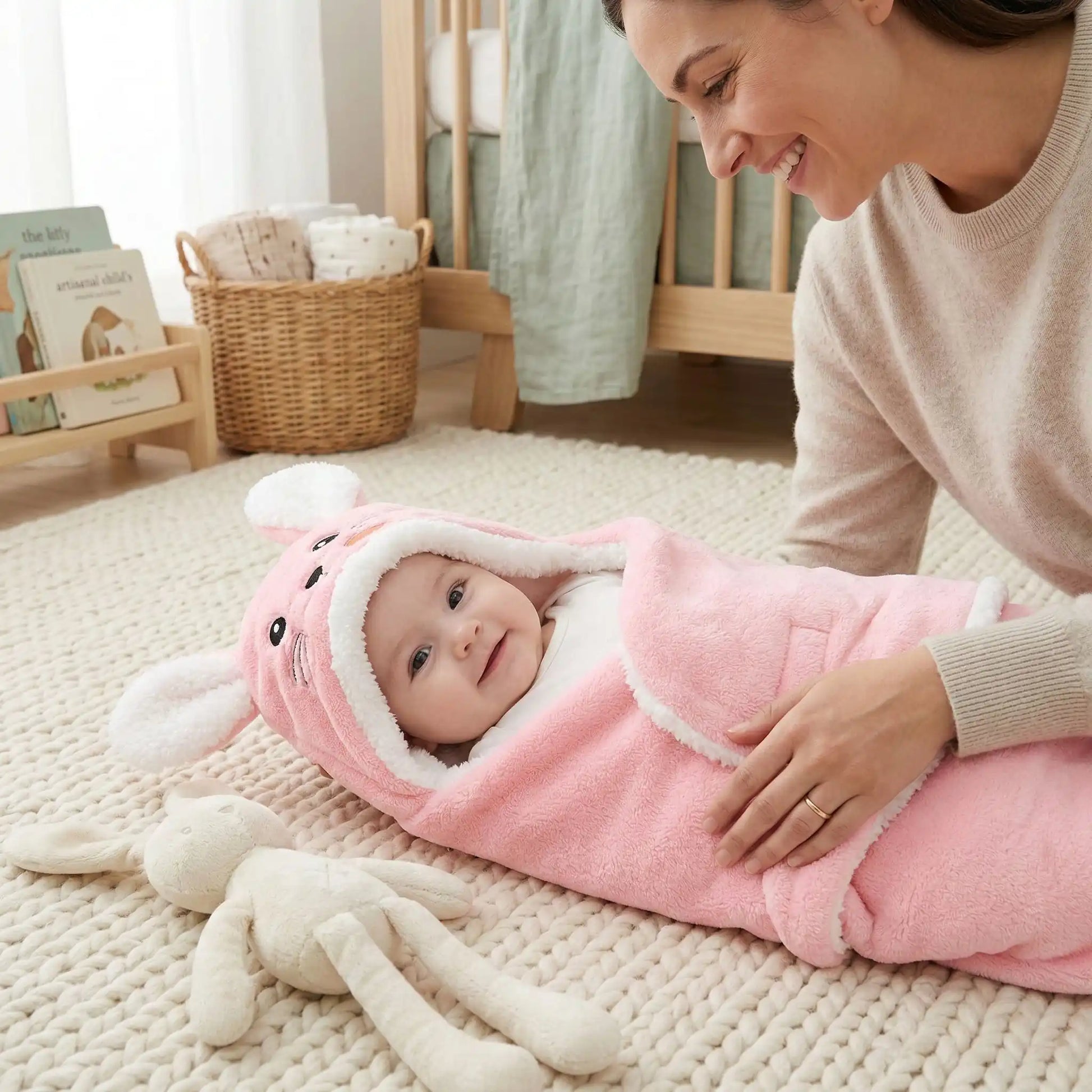 Cette couverture enveloppante crée un cocon rassurant qui garde votre nouveau-né bien au chaud, exactement comme dans vos bras. Imaginez votre bébé emmailloté dans cette polaire douce, sa petite tête protégée par la capuche à oreilles. Plus de couvertures qui glissent. Plus de réveils brusques. Juste un sommeil paisible et un sourire serein.